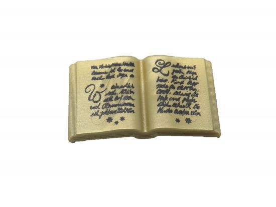 Buch offen dunkelgold mit schwarzer Schrift